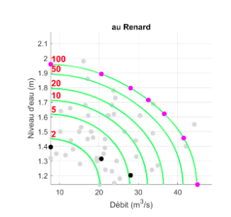 Figure 2. Isolines of 2, 5, 10, 20, 50 and 100 year compound floods for the combined series of maximum annual flows and maximum water levels with an interval of ±1 day, including the effects of rising sea levels at a time horizon of 2100. The scenarios selected at the outfall of the Rivière au Renard are identified in purple, while the black dots illustrate the same scenarios, but without the effect of rising sea level.