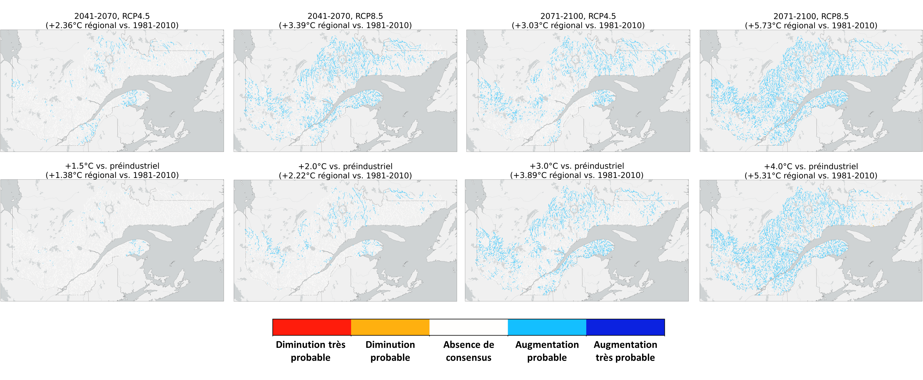 Que ce soit en milieu ou en fin de siècle, le RCP8.5 indique une augmentation probable des crues sur un territoire beaucoup plus grand que le RCP4.5. De ce fait, l’approche par degrés de réchauffement est non seulement plus simple à décrire, avec une progression des tronçons « bleus » de la Gaspésie au nord du Québec d’une figure à l’autre, mais permet également d’expliquer la complexité de l’approche par horizons. Effectivement, le RCP8.5 est déjà plus chaud à l’horizon 2041-2070 que le RCP4.5 en fin de siècle, d’où le nombre plus grand de tronçons « bleus ». Cette simplicité s’explique, entre autres, par le fait que cette approche permet de contourner certaines sources d’incertitudes, dont celle liée aux scénarios d’émissions de gaz à effet de serre.